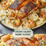 A creamy and flavorful Salmon and Shrimp Alfredo featuring tender fettuccine pasta tossed in a rich Parmesan and garlic cream sauce, topped with perfectly cooked salmon and shrimp. This elegant seafood pasta dish serves four and is easy to prepare in under 30 minutes, making it perfect for a cozy family dinner or special occasion.