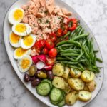 On a large platter or shallow bowl, create a bed of baby greens as your base. Layer on the flaked salmon, cooled green beans, potato pieces, cherry tomatoes, sliced cucumbers, Greek olives, and radishes. The variety of colors and textures here is what makes the Salmon Nicoise Salad Recipe so visually inviting and satisfying to eat.