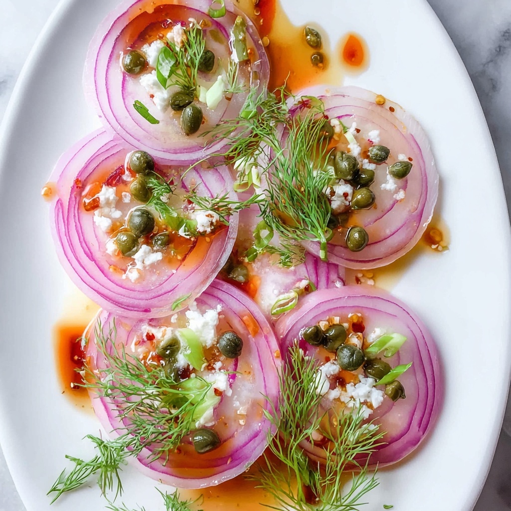 A quick and easy Savory Onion Snack featuring thinly sliced red onions enhanced with a zesty mix of lemon juice, olive oil, balsamic glaze, honey, rich blue cheese, briny capers, and fresh dill. This no-cook recipe is perfect for a flavorful appetizer or light snack.