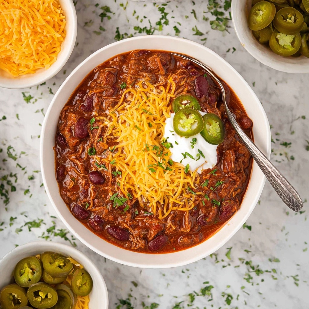 Classic toppings like shredded cheese, sour cream, diced onions, and fresh cilantro elevate this chili to a next-level experience. For a little extra zing, try sliced jalapeños or a squeeze of lime juice to brighten those deep, smoky flavors.