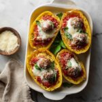 This comforting and wholesome recipe features roasted spaghetti squash filled with flavorful turkey meatballs simmered in marinara sauce and topped with melted mozzarella and Parmesan cheeses. It’s a low-carb alternative to classic spaghetti and meatballs, perfect for a satisfying family meal.