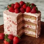 This Strawberry Box Cake is a simple, moist, and fluffy cake made from a strawberry cake mix, enhanced with eggs, oil, and water or milk. Easy to prepare and perfect for gatherings, it can be garnished with fresh strawberries and topped with whipped cream or your favorite frosting for a deliciously fruity dessert.
