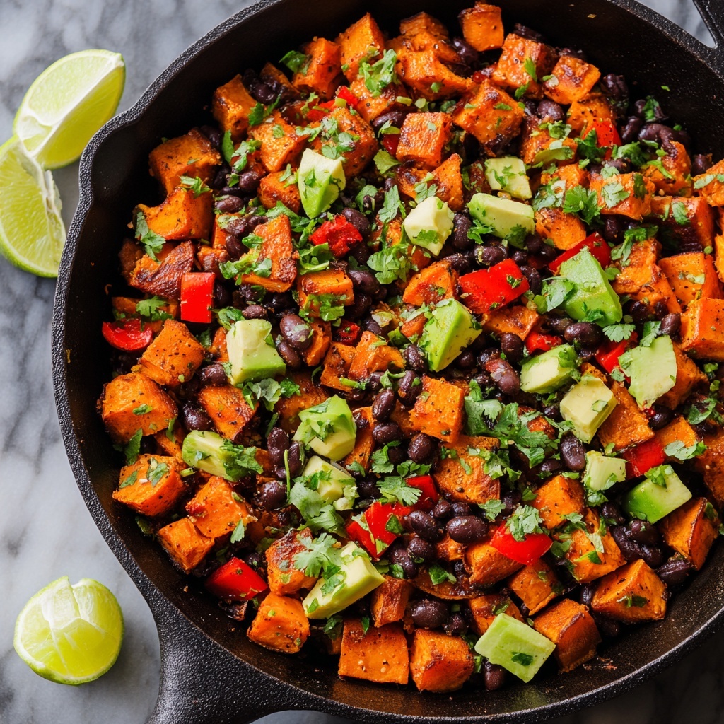 A spiced, hearty, and satisfying Sweet Potato & Black Bean Hash perfect for a nutritious breakfast or a wholesome meal. This dish combines tender sweet potatoes, sautéed bell peppers, onions, and protein-packed black beans, seasoned with cumin and smoked paprika for a flavorful and comforting skillet meal.