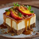For an eye-catching platter, serve individual slices in clear glass dessert plates to showcase each layer — crust, cheesecake, cobbler, and caramel. Or try drizzling extra salted caramel artistically over the plate and topping with fresh peach slices or edible flowers for a restaurant-worthy finish that’s sure to impress guests.