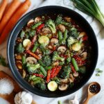 A vibrant and healthy vegetable stir fry packed with colorful vegetables and a savory soy-based sauce. This quick and easy recipe is perfect for a nutritious weeknight dinner, featuring a blend of broccoli, bell pepper, carrots, mushrooms, and onions sautéed to perfection.