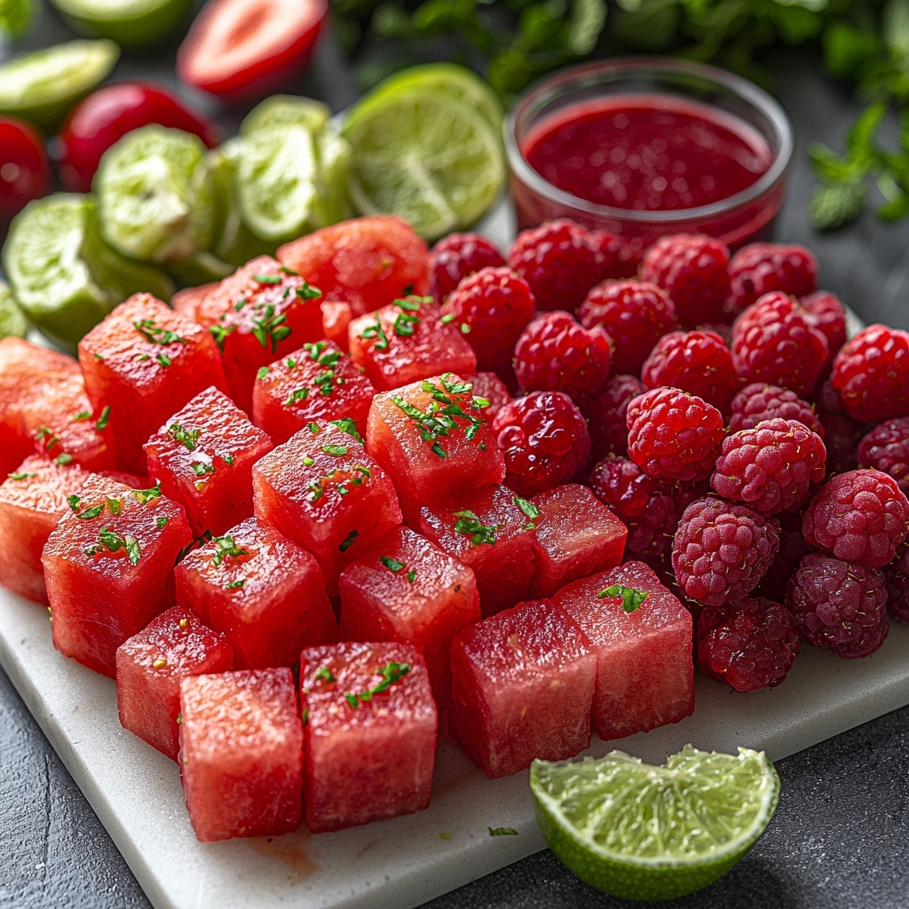 A vibrant and refreshing Watermelon Fruit Salad tossed with a zesty Lime Mint Dressing, perfect for a light, healthy snack or side dish. This colorful mix of watermelon, strawberries, raspberries, and cherries is elevated by a tangy, sweetened dressing featuring fresh lime juice, agave syrup, and chopped mint, creating a delightful combination of sweet and citrus flavors.
